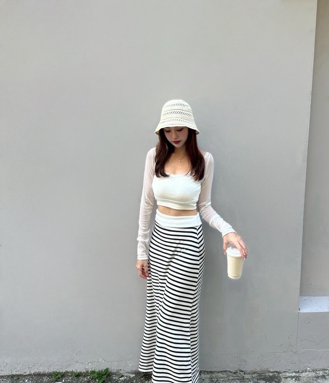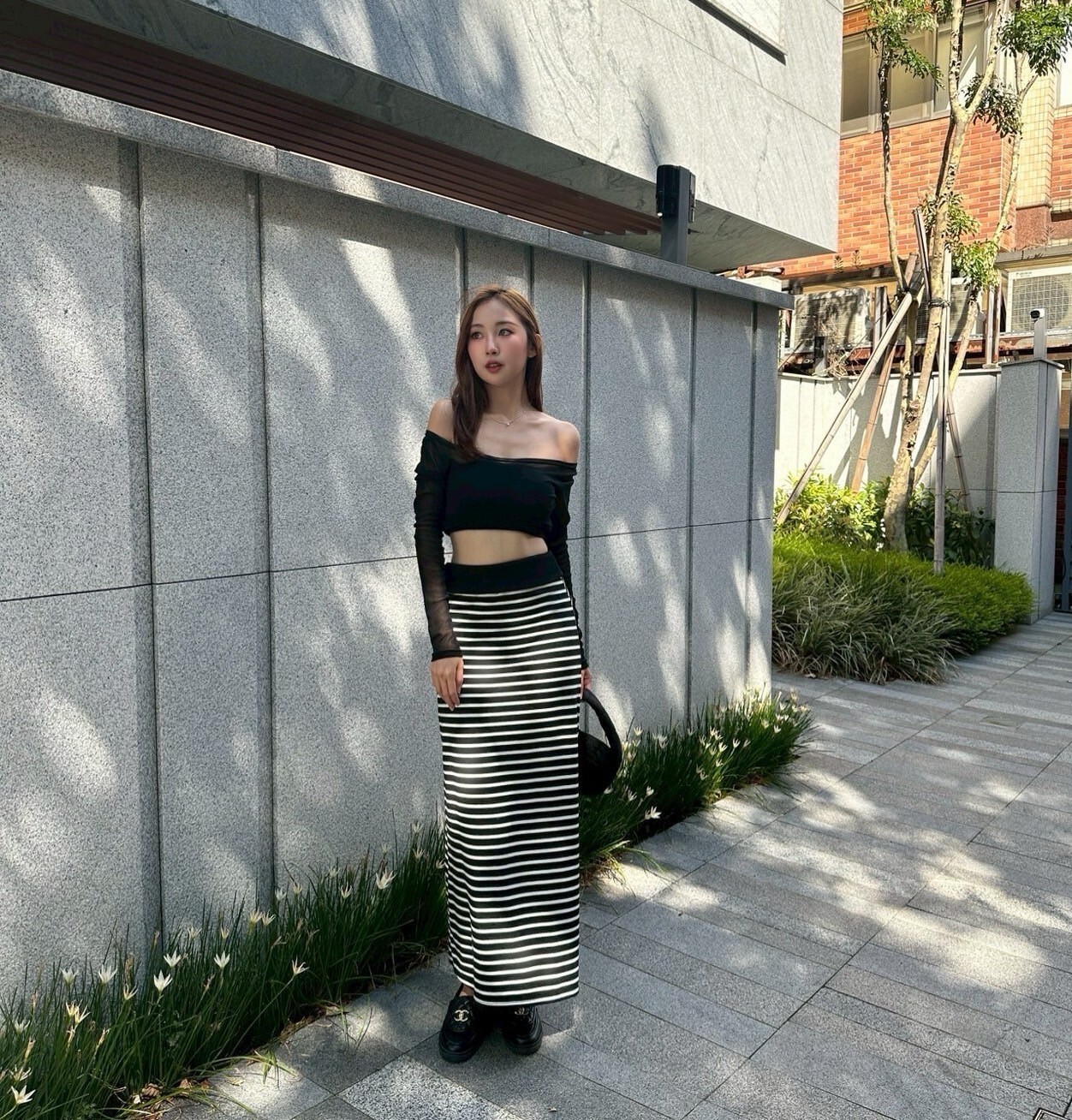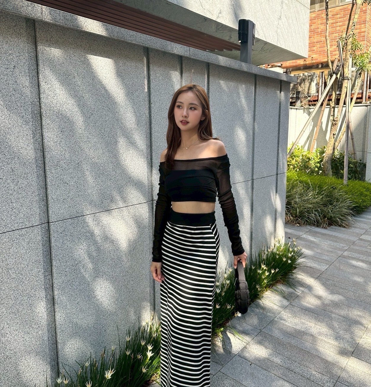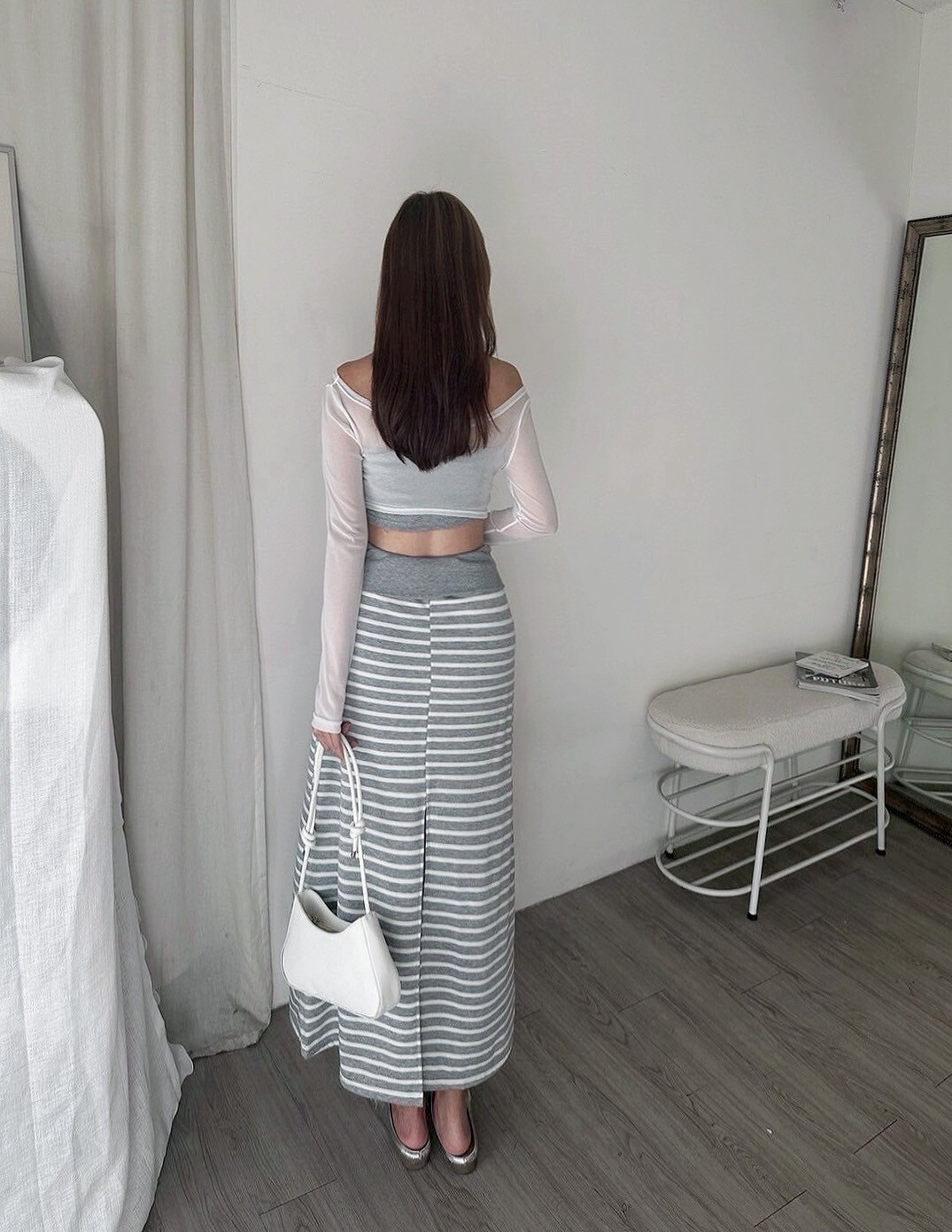 搭配條紋長裙 裙襬後面有大開岔