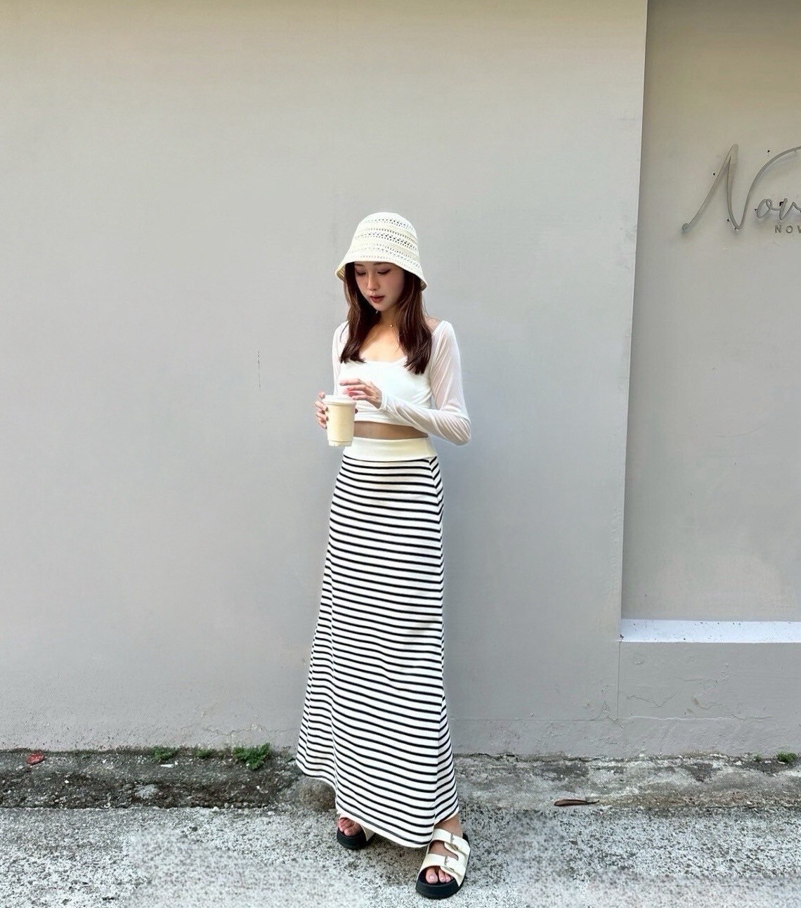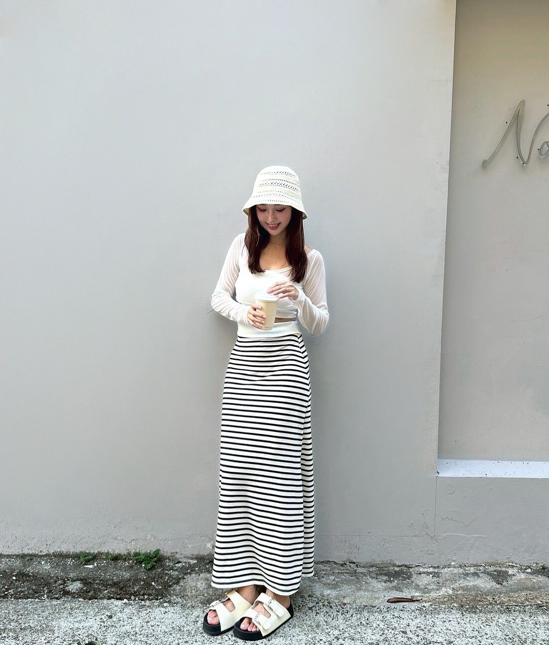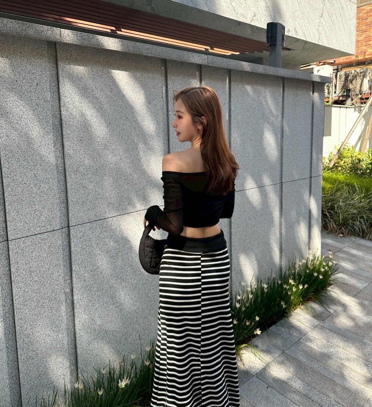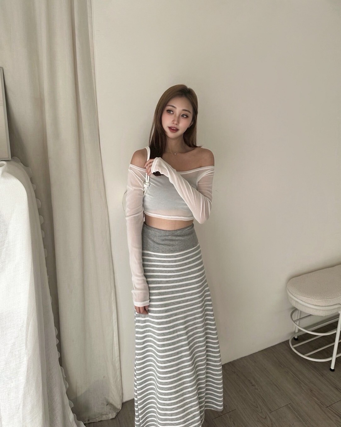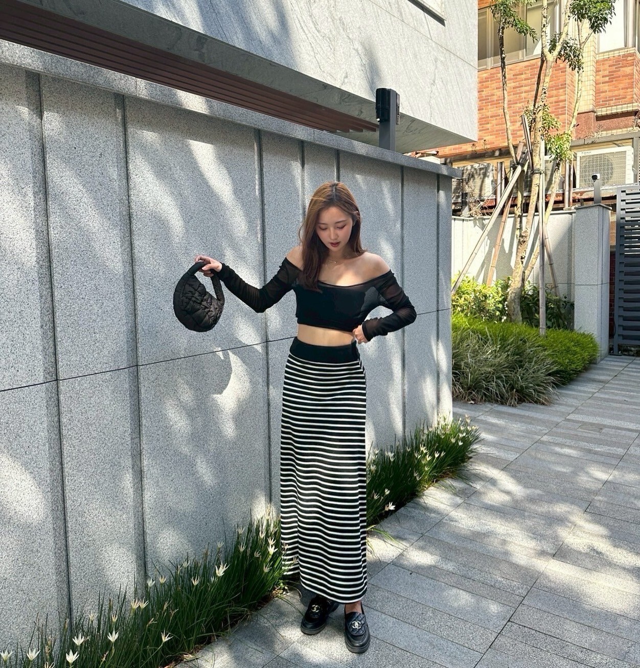 搭配條紋長裙 裙襬後面有大開岔