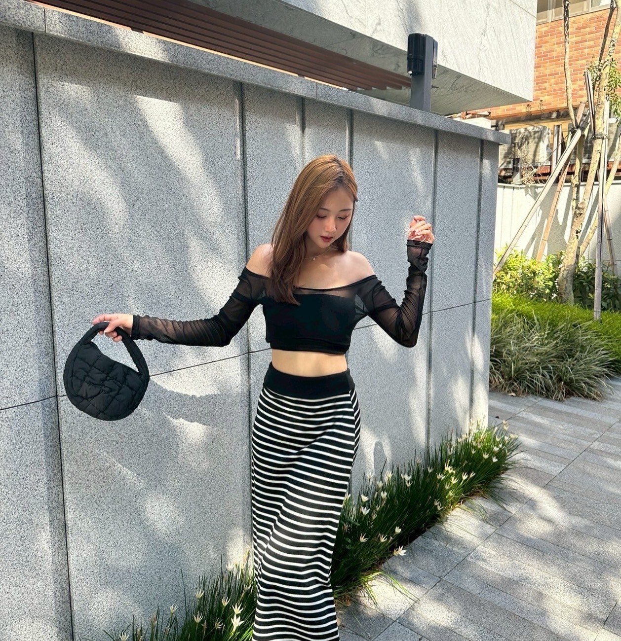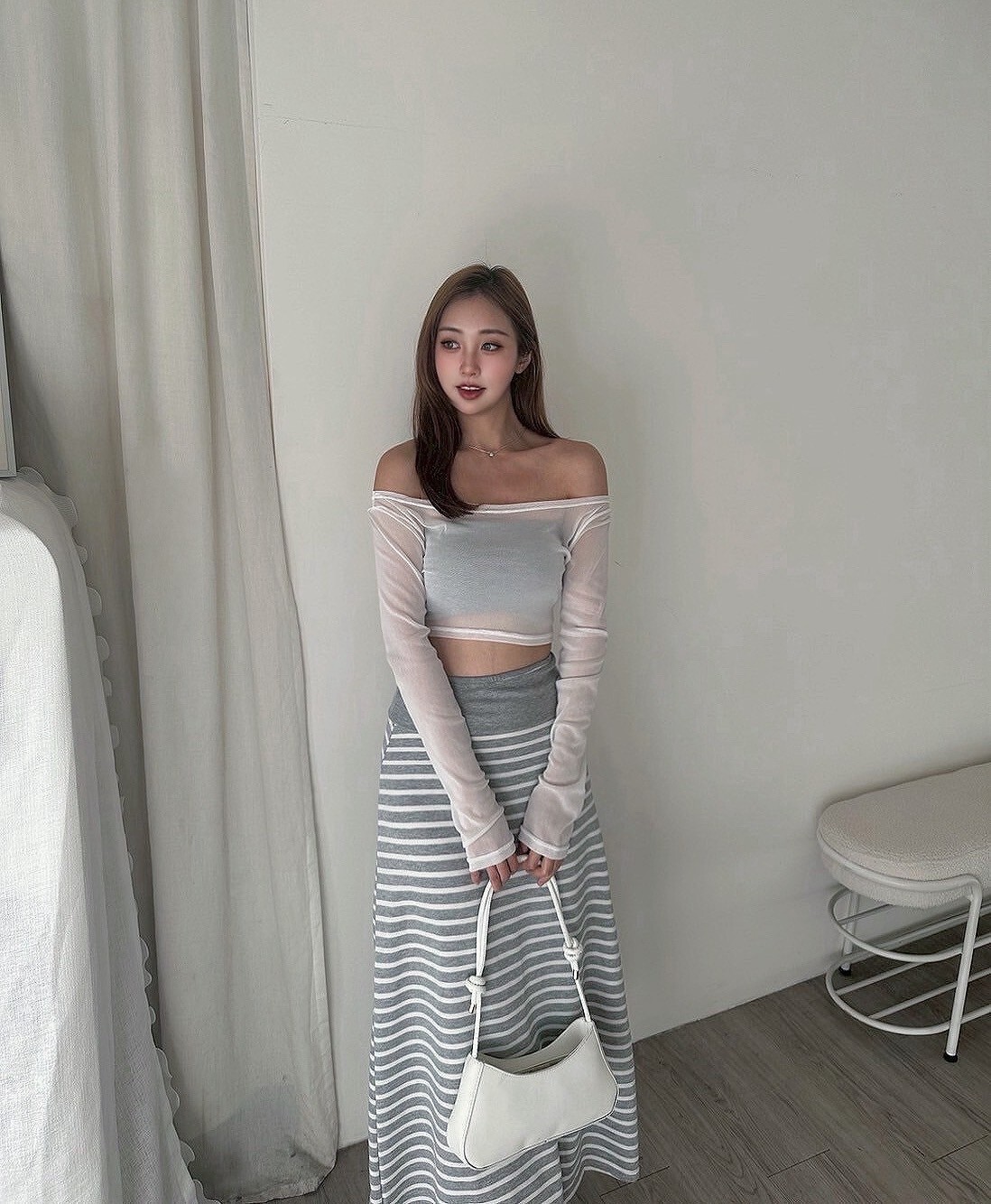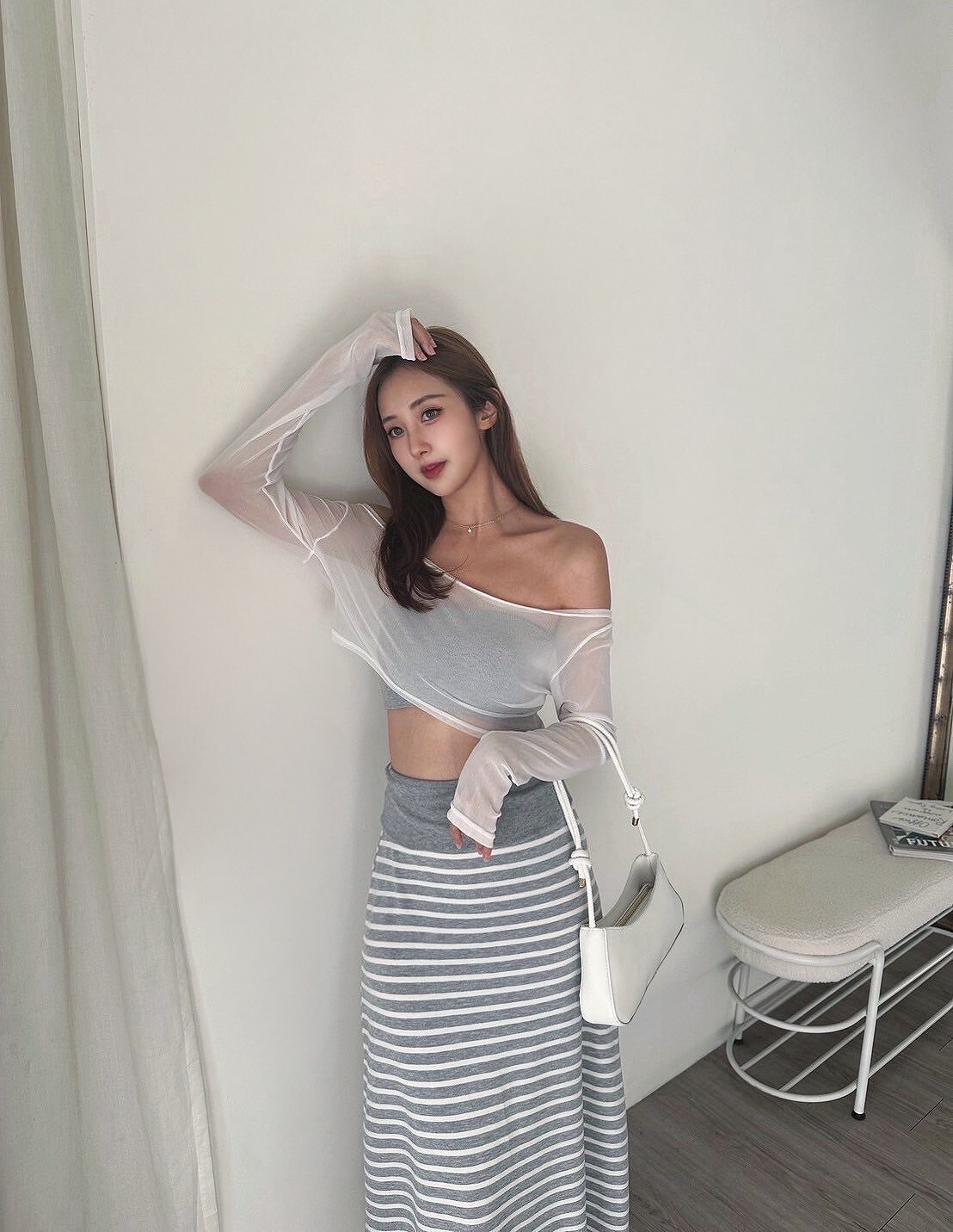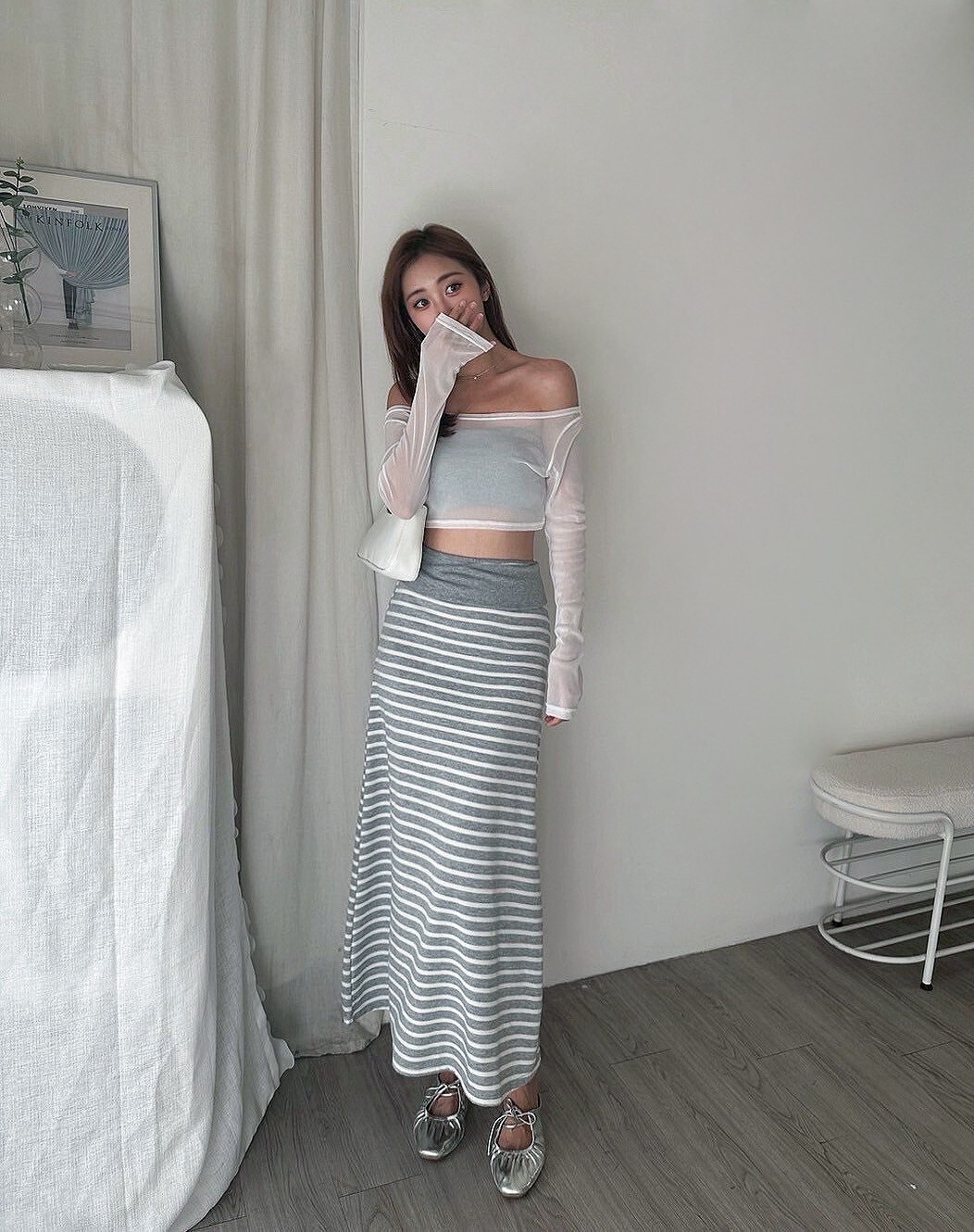 搭配條紋長裙 裙襬後面有大開岔
